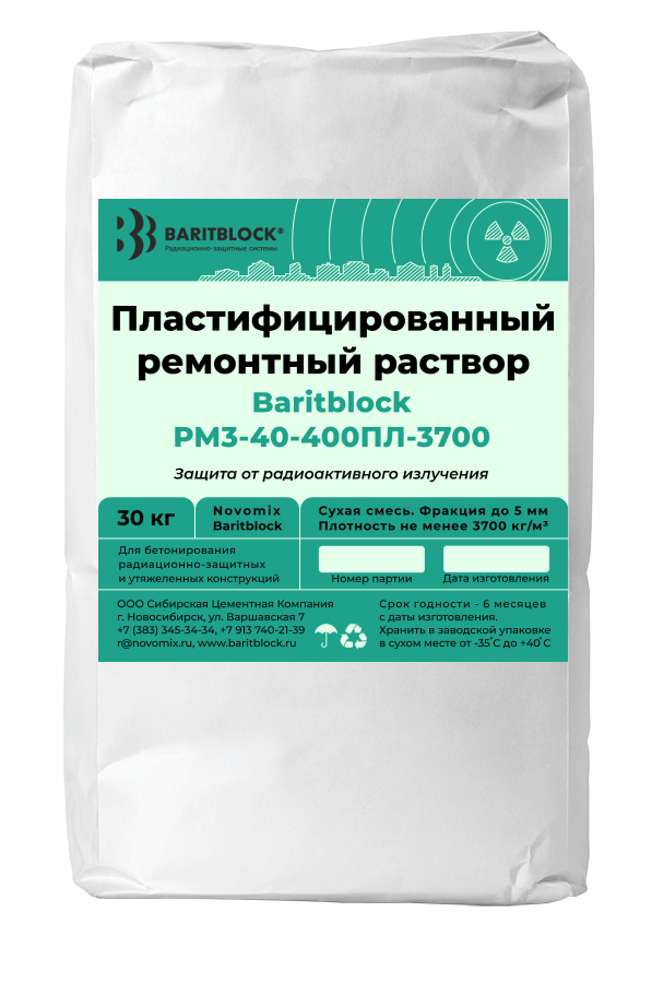 Применение. Ремонтный раствор Baritblock предназначен для ремонта конструкций из тяжелого бетона и радиационно-защитных конструкций на горизонтальных поверхностях. Применяется в медицинских учреждениях, томографических, научно-исследовательских центрах на установках с радиацией, требующих биологической защиты, в атомной энергетике, промышленных предприятиях, которые используют источники ионизирующего излучения, хранилищах и складах радиоактивных материалов и инструментов. Используется как особо тяжелый бетон для утяжеления конструкций.
